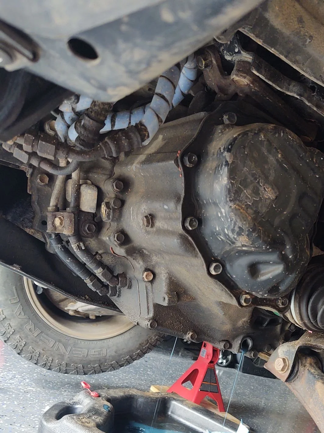 Pictured is actually my own RAV4, not hers. I didn’t get a picture of hers before we fixed it. Coincidentally, mine had leaked from the same spot. Towards the top left of this picture you will see a fitting which had a slight leak. Hers was much more significant. It would paint the bottom of the car with gear oil. Not ideal, since that is supposed to stay in the transmission. Now, it may have been possible to fix these, but I don’t have the tools for that, and I don’t think that it is really necessary. What I did on mine, and what we repeated on hers, was getting a cooler loop from an E153 and installing it here. The E250F uses the same oil pump and associated fittings as any other wide diff E series. This part may have came off of a Camry, and MR2, or something else. I don’t know for sure. Either way, easy install, and that one is fixed.